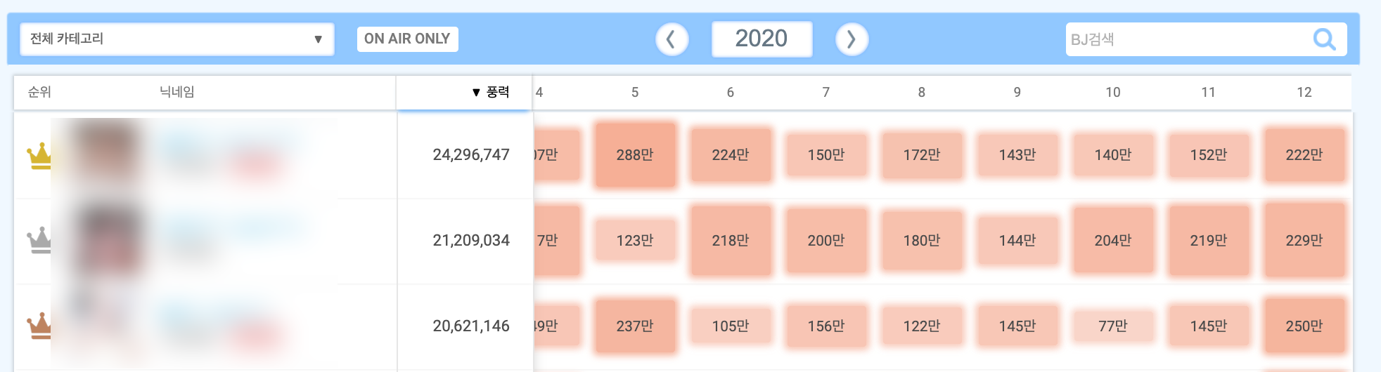 2020년 년간 풍력 1, 2, 3위를 봤는데 무려 별풍선 1위 2400만 개의 위엄을 볼 수 있습니다. 수수료 계산하지 않고 단순 계산으로만 24억 어치 별풍선을 받았는데 요즘 인터넷 플랫폼, 개인 방송 등 연예인 그 이상의 파급력을 보여주고 있는 시대가 위 풍투데이 사이트를 보면 어느정도 실감이 납니다.